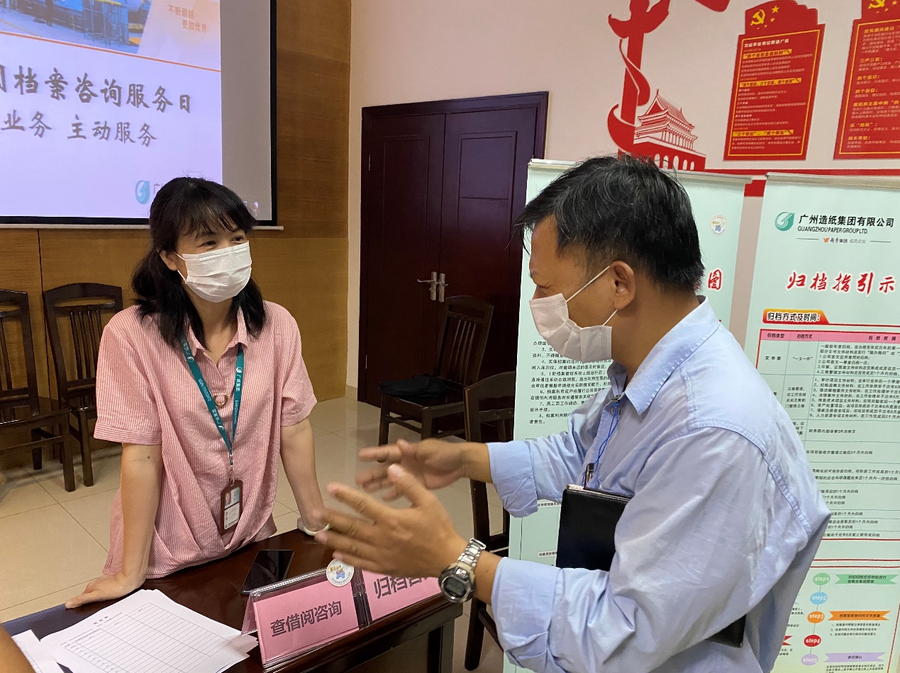 6月30日下午,广纸集团设立了“广纸集团档案咨询服务点”,面向各部门、一线员工开展文件归档与档案利用等咨询服务。
