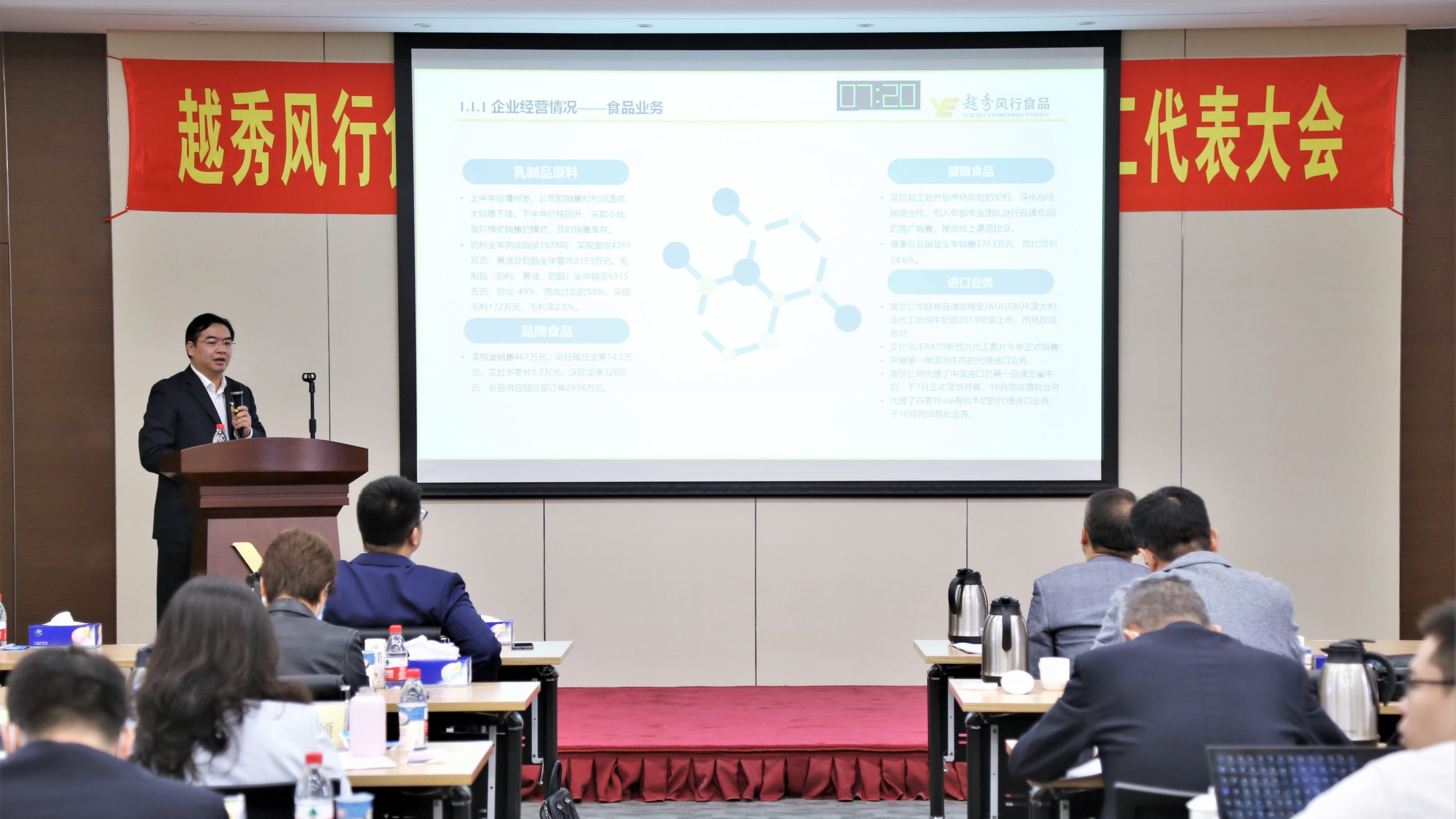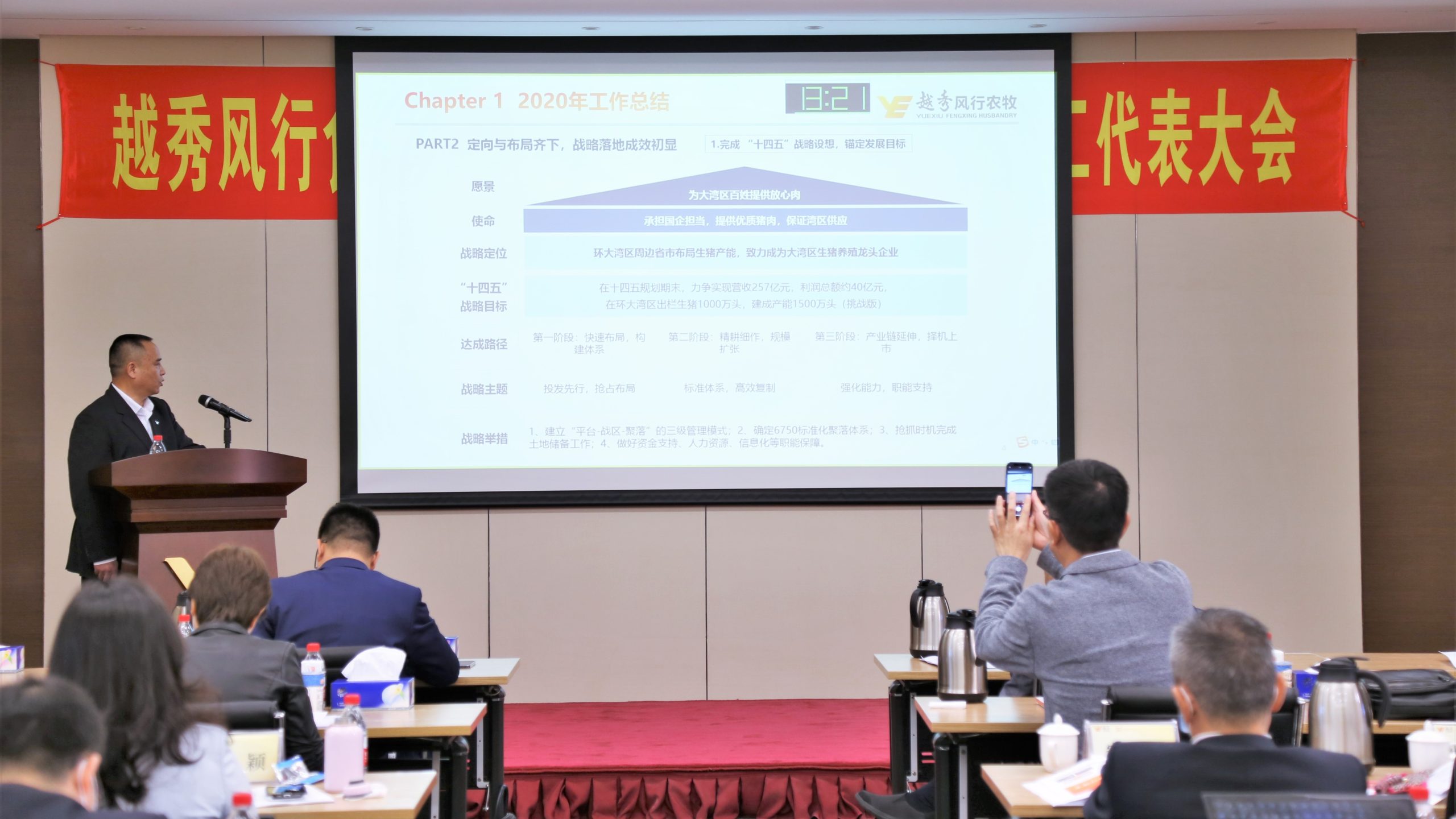 强化能力绘新篇》的总经理工作报告,对于2020年的工作情况,他从七个方面做出总结:一是主要经营指标基本完成,规模向好。对比上年企业营业收入增长了22%。二是重点项目成果突出。完成了板块重组整合;生猪产业发展按下“快进键”,快速储备了373万头生猪产能用地,首个大型自建项目实现竣工和引种;成功重整辉山乳业,乳业实现全国化布局;接管皇上皇、食品集团,产业链条补齐。三是业务发展齐头并进。乳业、风行农牧、商贸、生鲜、冷链、大湾区“菜篮子”项目、资产经营等工作成效显著。四是组织管控不断优化。战略投资与运营管理、人才队伍建设、资金与费用管理、风险防控、信息化建设、安全管理、品牌、档案、保密管理工作有效提升。五是党建引领,融合发展。基层党建、巡察整改、执纪监督问责、企业文化与群团组织建设、扶贫攻坚、意识形态工作融合发展。六是企业在业务战略、核心能力、专业人才队伍、激励机制、安全生产管理等方面还存在短板。