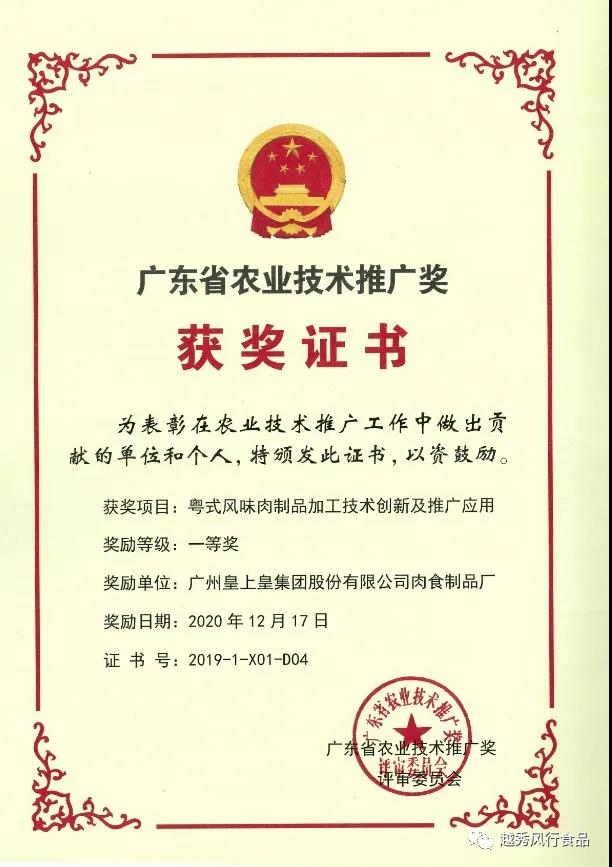 近日,皇上皇股份属下肉食制品厂“粤式风味肉制品加工技术创新及推广应用”项目荣获广东省农业技术推广奖一等奖。